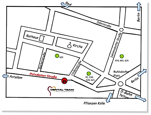 Aus Berlin erreichen Sie uns mit dem Bus: X10 (Zoologischer Garten – Teltow)184 (Südkreuz Bhf – Teltow)620 (S Bhf Wannsee – Teltow Stadt S Bhf)Aus Potsdam erreichen Sie uns mit dem Bus: X1 (Potsdam Hbf – Teltow Bhf) 601 (Potsdam Hbf – Teltow Sigridshorst) 602 (Potsdam - Teltow)